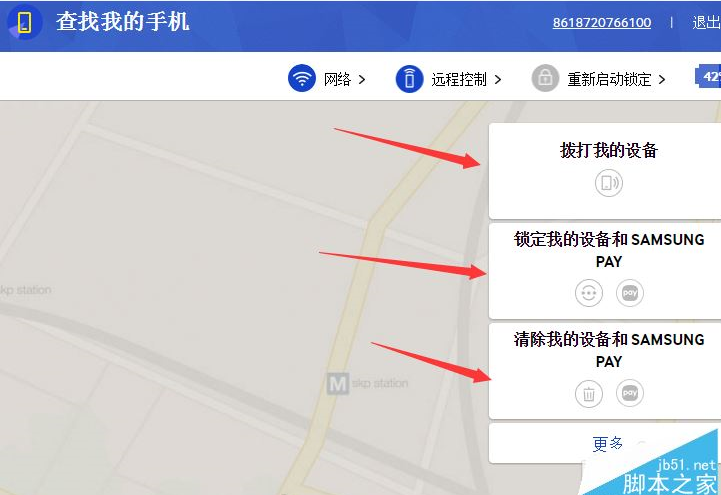 在网页的右边还可以点击 拨打我的设备 锁定我的设备和SAMSUNGPAY 清除我的设备和SAMSUNGPAY 按钮 对手机进行远程控制
