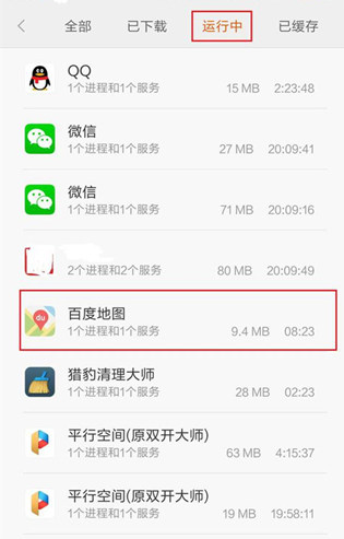 2、选择“运行中”栏目,在这里面将没用的APP手动停止掉。