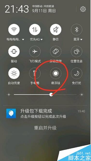 方法1:下拉手机主页面可以见到如图所示各项控制按钮,点击开启悬浮球功能,