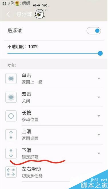 进入悬浮球功能管理,调整对于它的每一项操作这里设置“下滑锁定屏幕”即可