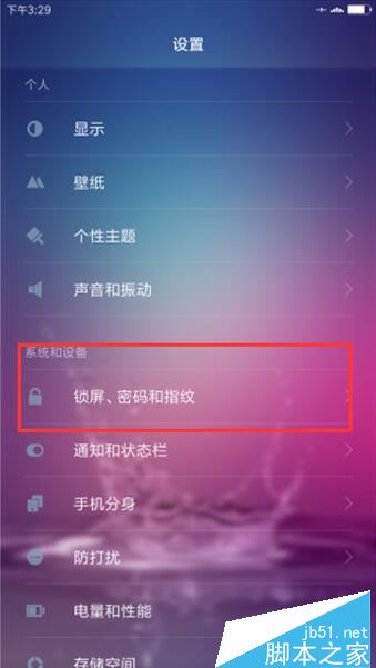 2、在打开的设置选项窗口,点击“锁屏、密码和指纹”选项。如图所示;