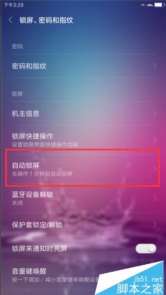 3、在锁屏、密码和指纹选项窗口,找到“自动锁屏”选项,默认无操作1分钟后自动锁屏。并点击它。如图所示;