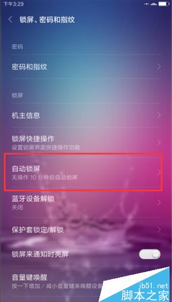 6、回到“锁屏、密码和指纹”窗口,看到自动锁屏中看到,默认无操作10分钟后自动锁屏。如图所示;