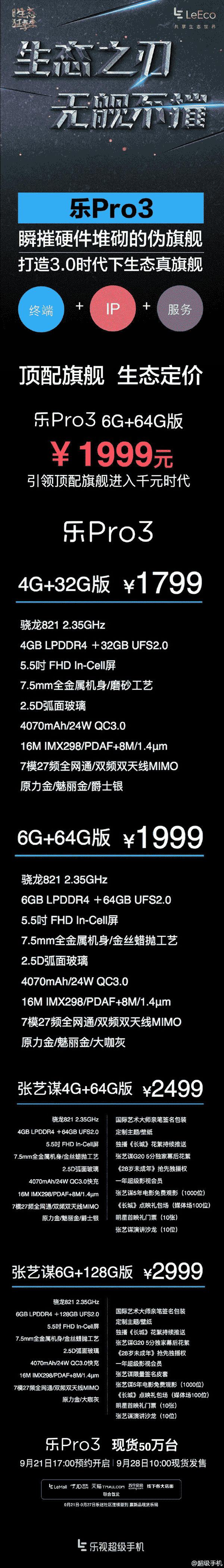 乐Pro 3分为四个版本,4GB+32GB 1799元,6GB+64GB 1999元,后者是主力型号。张艺谋定制版4GB+64GB版本为2499元,6GB +128GB 版本则定价2999元。