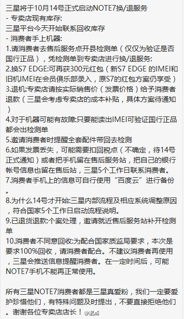 近日三星发出了召回通知,宣布无条件召回此前在国内销售的19万台Galaxy Note 7。此外,三星还宣布在全球永久停产/销售Galaxy Note 7。至此,一代机皇驾崩,结束了它短暂又屈辱的一生...现在有曝光了国行三星Note 7的退货流程,从图片来看,三星退换货服务将从10月14日正式开启(三星内部调整需要时间)。