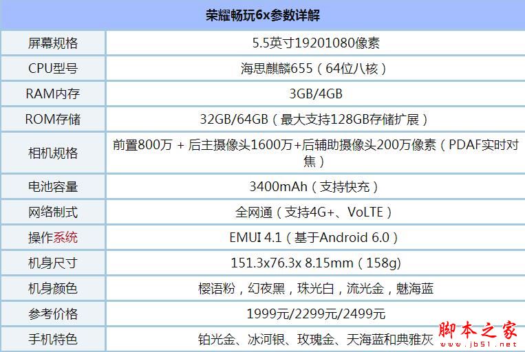 硬件方面,荣耀畅玩6X分为3个版本,主要基于内存与存储空间不同,搭载麒麟655八核64位处理器,3GB/4GB运行内存,32GB/64GB存储空间,后置主1600万像素摄像头,具备出色的性能与拍照体验。