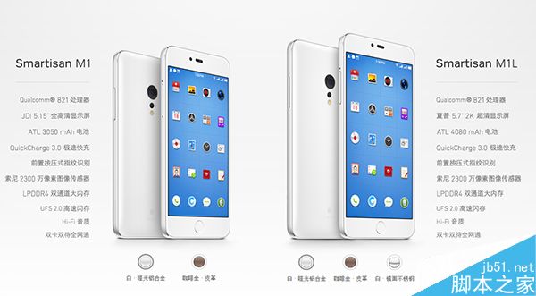 具体来说锤子M1和锤子M1L均搭载高通骁龙821处理器,支持QC3.0快充,搭载索尼爱IMX318 2300万像素摄像头,配备UFS2.0高速闪存,支持HiFi音质,双卡双待全网通,前置按压式指纹识别。