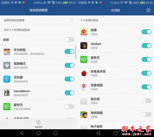 另外,在管家中你还能发现自启管理和应用锁,自启管理不用解释大家在电脑上估计都用过,应用锁功能可能有些用户并不熟悉,它可以将App加个密码,打开时需要输入密码才可以,同样支持指纹解锁,这样就再也不怕微信消息、相册被别人偷看了。