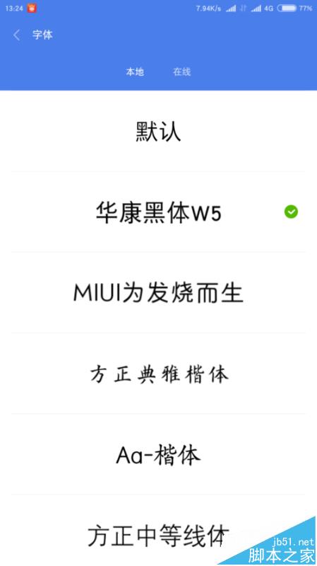 首先,看字体,点击字体选项,会跳入主题商店的字体选项,在这里我们可以选择在线和本地两个选项。我们可以自己选择自己喜欢的字体进行下载。这也是很方便的啊,虽说现在大部分手机都支持,但是小米手机的字体数目是最多的。同时我们也可以去论坛下载MTZ格式的字体。但是需要小米账号是小米设计师。小编就不介绍啦!