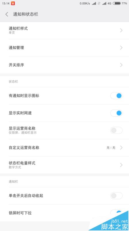 4、通知和状态栏,在这里,我们可以选择通知栏的样式,单页还是双页。可以显示实时网速。特别值得一说的就是可以自定义运营商的名称。自己想叫啥就叫啥。