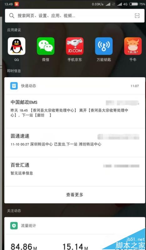 在主界面往左划就会显示近期应用与一些快递信息之内的都会在这里显示。这是安卓里的首例吧。也是很方便的。