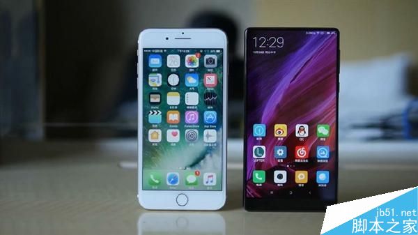 由于小米MIX三面都没有边框,正面屏占比达到了惊人的91.3%,远超iPhone7不到70%的屏占比。因此尽管小米MIX的屏幕尺寸达到了6.4英寸,但是和5.5英寸的iPhone 7 Plus放在一起,并没有显得大多少。