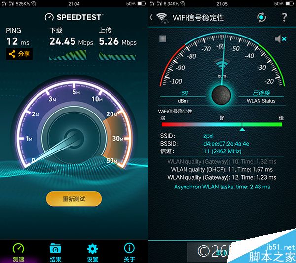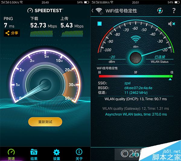 小编的路由器3支持同时发射2.4GHz信号和5GHz信号。通过测试可以看到,在最常见的的2.4GHz信号下,OPPO R9s的下载速度可以达到52.73Mbps。同时WiFi连接稳定性为“佳”,尽管在2.4GHz下没能达到百兆宽带的最高速度,但也是由于2.4GHz网络的局限性导致的。