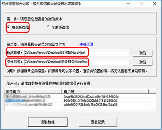 7.下载并安装聊天记录导出查看软件将上面保存的微信聊天记录导出到电脑上查看;在百度搜索楼月微信聊天记录导出恢复助手;,安装后打开此软件。选择安卓版微信;,设置数据目录及资源目录地址为保存在电脑中的两个相对应的MicroMsg文件夹地址;然后点击读取数据;,在数据读取框中将显示出所有在此手机上登录过的微信账号。所以用这种方法不论你有两个或多个微信账号,只要在此手机上登录过的,都可以一一查看到。