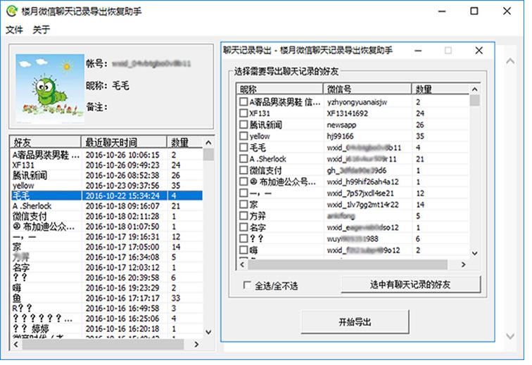 点击选择软件窗口左上角的文件;菜单中的下单菜单导出聊天记录;,在弹出的聊天记录导出窗口中选择需查看的微信好友账号后点击开始导出;按钮,如下图所示: