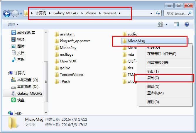 1.用数据线连接手机与电脑,在电脑中打开手机盘符下的Tencent文件夹并找到MicroMsg文件夹,将此文件夹复制保存到当前电脑中,并重命名为资源目录MicroMsg;。
