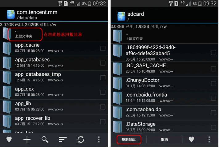 5.再连续三次按..;返回根目录,点击进入sdcard文件夹,并点击底部的复制到此;按钮,如下图: