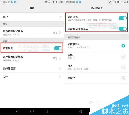三、最后,点击联系人设置,选择【精准识别】,简洁模式,显示SIM联系人,可以最好的显示手机联系人,如图所示: