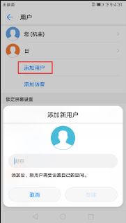 打开【设置】,点击【高级设置】 > 【用户】。点击【添加用户】,输入用户昵称,然后点击【创建】。创建完成后,您可以切换到新用户,然后根据屏幕提示完成新用户数据的配置。(提醒:A.在【锁定屏幕设置】区域,您可以打开【允许在设备锁定时添加用户】旁的开关,然后在锁屏界面通过向下滑动状态栏直接创建用户。B.您最多可以添加 3 个子用户。)