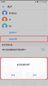 打开【设置】,点击【高级设置】 > 【用户】。点击【添加访客】 > 【创建】。(在【锁定屏幕设置】区域,您可以打开【允许在设备锁定时添加用户】旁的开关,然后在锁屏界面通过向下滑动状态栏直接添加访客。)