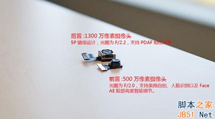 而后置方面则为一颗1300万像素的摄像头,5P镜组设计,F2.2光圈,配备双色温闪光灯,支持相位对焦功能,官方称最快对焦速度可达到0.2s对焦。