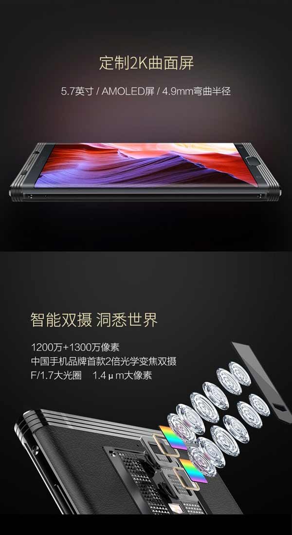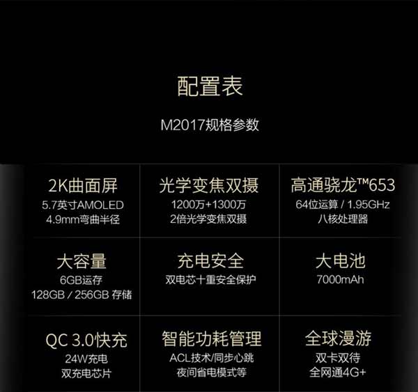 配置方面除了骁龙653处理器偏弱之外都堪称旗舰级别:三星5.7寸2K AMOLED双曲面屏幕、6GB内存、128/256GB存储、后置1200+1300万像素双摄像头、7000mAh电池和24W快充、活体指纹检测、通信/数据/支付三大安全、双卡全球全网通4G+。