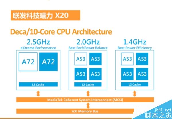 从联发科公布的资料来看,Helio X20的十核心组成分为,两颗2.5GHz主频的Cortex-A72核心,四颗主频2GHz的Cortex-A53核心以及四颗主频1.4GHz的Cortex-A53核心,并通过联发科自主的MCSI互联总线进行连接。另外,在GPU方面采用的是主频780MHz的Mali-T880 MP4,支持双主摄像头、最高支持3200万像素摄像头、2K显示屏(刷新频率提高至120Hz)、4K分辨率视频的拍摄,同时增加3D深度和多重降噪。
