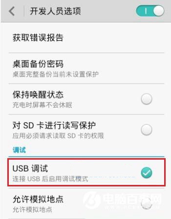 3,已经确认出现提示之后,返回“设置”界面,在设置底部找到“开发者选项”进入,打开USB调试即可,如下图所示:
