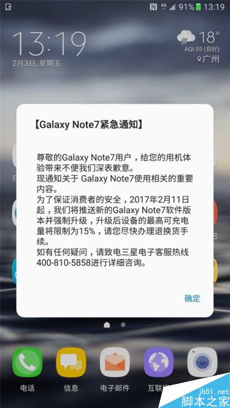 为了配合三星的强制性退换货措施,在海外多地已经实行的新政策终于来到了国行Note7上。据网友@卻遠 爆料,从2月11日开始,国行版本的三星Note7将会强制更新最新的系统版本,在更新之后电量最多只能充到15%,三星建议用户尽快进行设备退换。