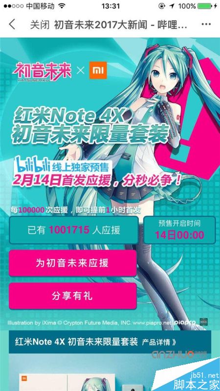 bilibili网站上的红米Note 4X页面显示,每10万次应援,红米Note 4X初音未来限量套装的线上预售就提前一个小时。最新的数据显示,应援的次数已经突破一百万,而新机的首轮预售时间已经被提前至2月14日0时。