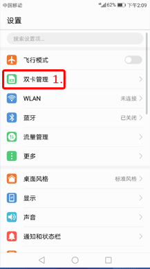 打开【设置】>点击【双卡管理】,根据实际需要,分别对两张 SIM 卡进行设置。点击【默认拨号卡】,可设置拨打电话时显示两张 SIM 卡或仅显示一张默认 SIM 卡。