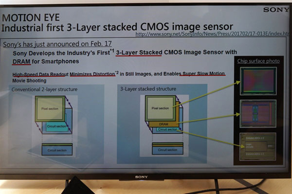 据介绍,索尼这种三层堆叠式传感器是基于传统CMOS传感器进行改进,在像素层和信号处理电路层之间又加入了一层DRAM。从而让传感器获得高速读取的能力,从而在拍摄快速移动物体时能够更加从容,有效的减少拍摄时所产生的焦平面失真现象。