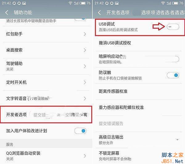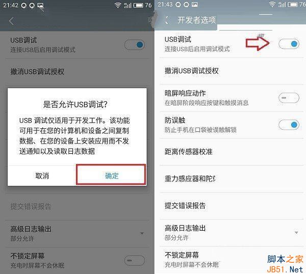 第二步:继续进入魅蓝5s设置中的的「开发者选项」->「USB调试」。默认这个USB调试是关闭的,点击开启就可以了。