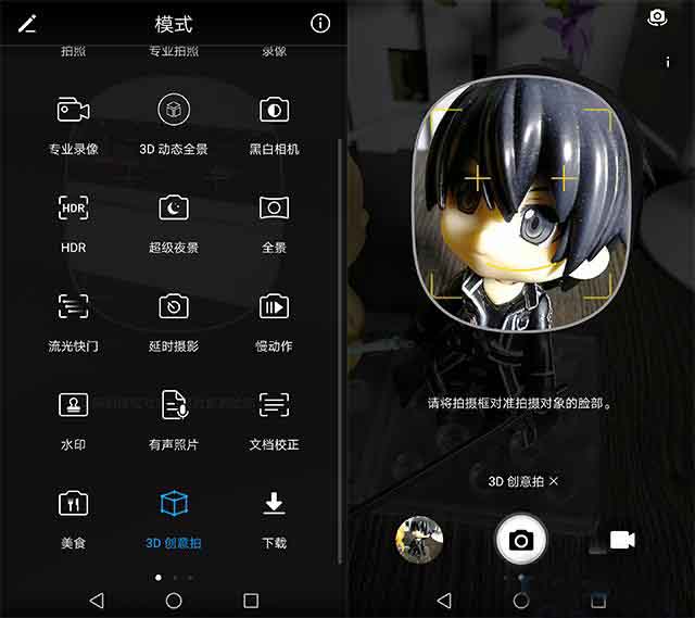 完成系统更新之后,就可以在荣耀V9自带相机应用中,找到3D创意拍功能。开启之后用摄像头对准他人的脸部,左右调整之后就可以创建立体头像。