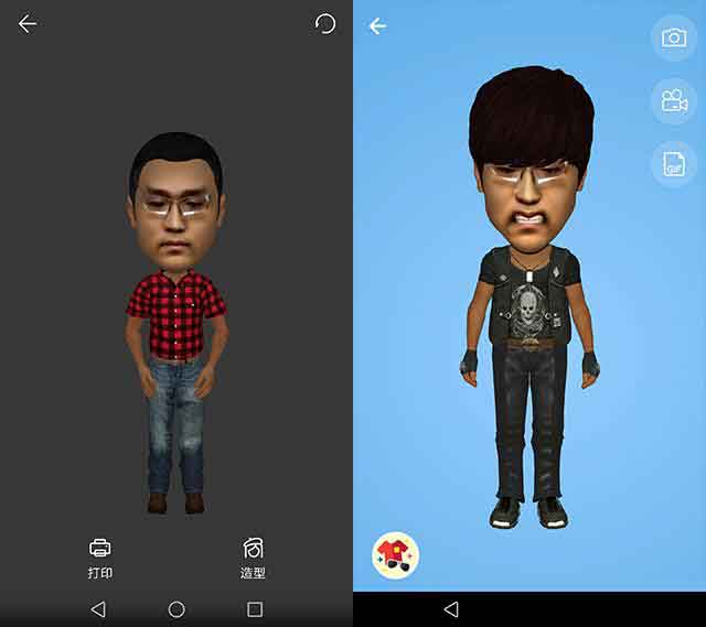 建立了3D头像之后会自动生成一个虚拟人偶,用户可以自由调整身体、穿着、发型、表情甚至动作,如果戴着眼镜能够正确识别模拟。将虚拟人偶调整到满意之后,还可以保存为GIF分享到社交软件,或者通过3D打印功能打造自己的专属玩偶,是一个非常有意思的功能。