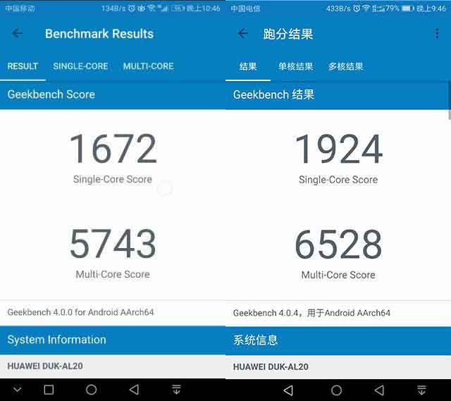 首先是GeekBench 4跑分,单核性能由升级前的1672分(左图),飙升至1924分(右图);多核性能由升级前的5743分(左图),提升至6528分,性能优化非常明显。