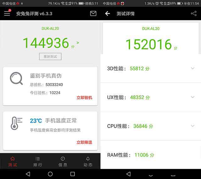 这次荣耀V9的更新对系统进行了一系列的优化,具体表现就是各项跑分数据又有了明显提升。