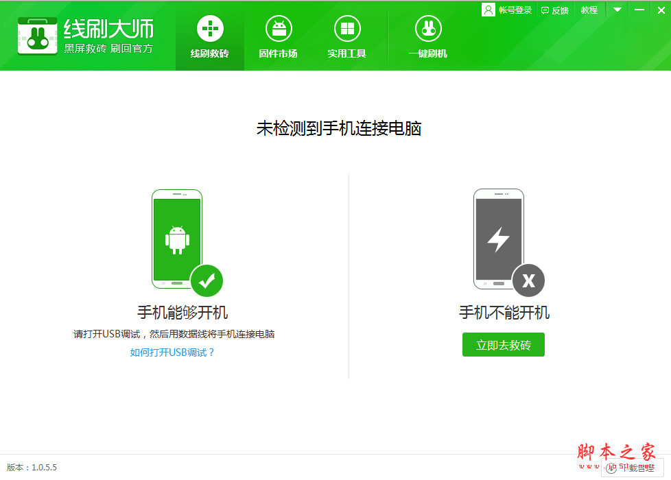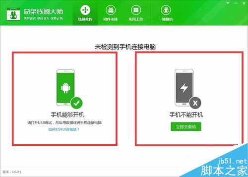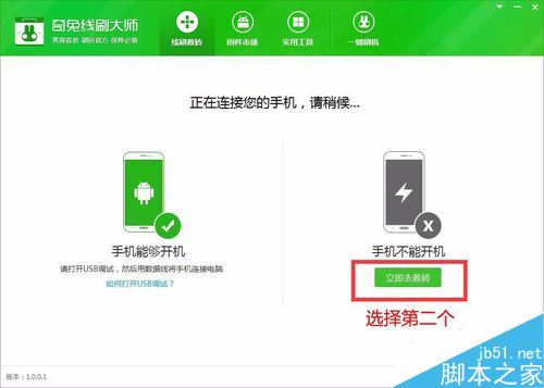 打开刷机软件的界面后,会出现两个选项。我们的情况需要选择第二个黑屏状态的,进行比较普遍的无法正常开机的救砖流程。
