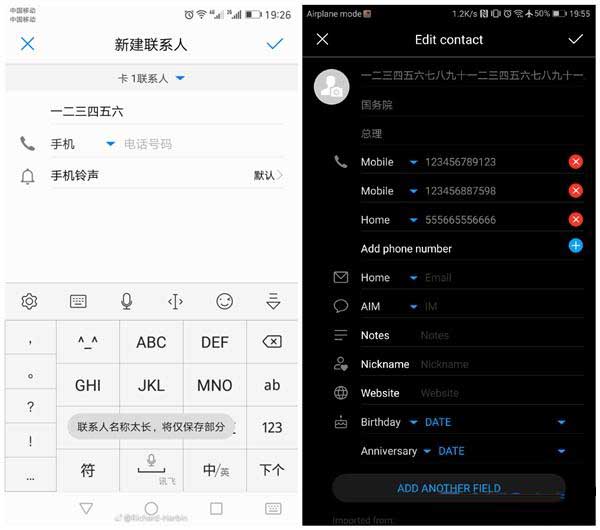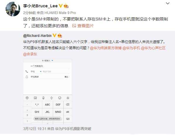 近日,有网友在微博吐槽“华为P9手机联系人姓名只能输入六个汉字,给我这种备注人名+单位信息的人来说太遗憾了。”