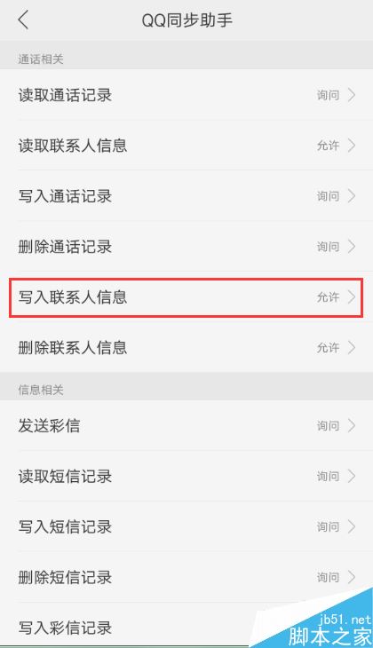 6、点击“写入联系人信息”的权限设置成禁止即可。