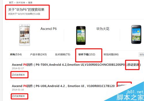 出现搜索结果,有很多个关于华为P6的固件,我们需要哪一个呢。根据手机版本来选择。最简单的区分就是移动、联通、电信定制、无定制。