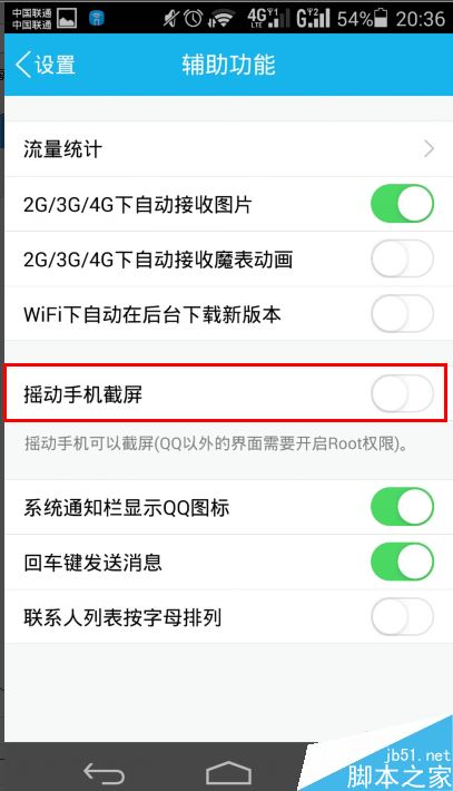 第四种:手机QQ也自带截图功能,在【设置】-【辅助功能】里,有摇一摇截屏。注意,没有root权限的话,只能截QQ的界面。
