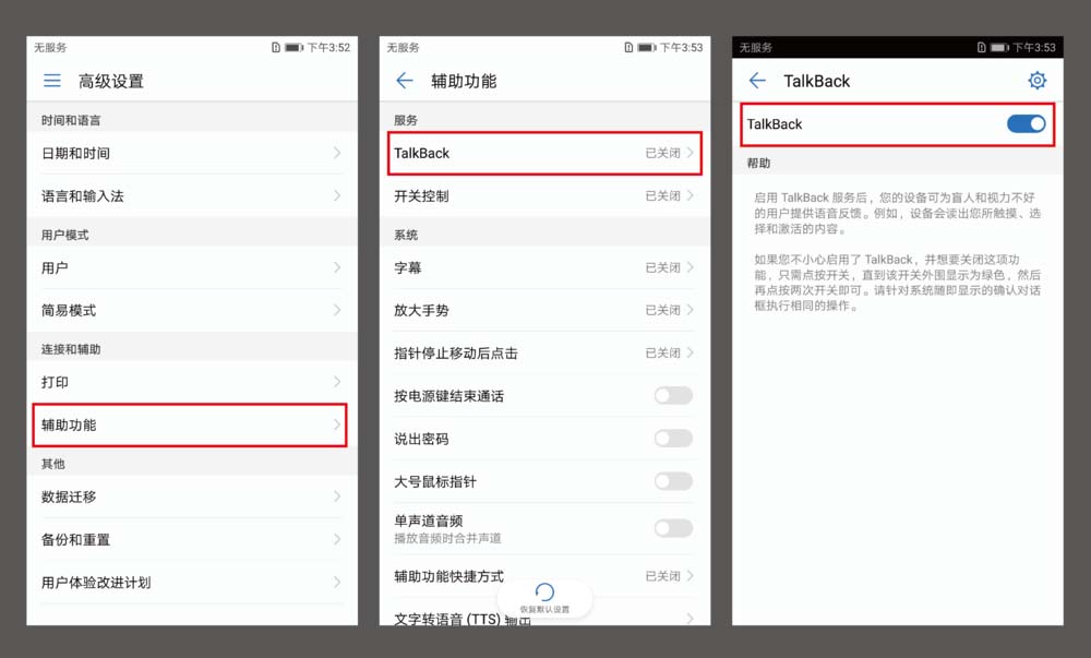 打开设置,点击高级设置 > 辅助功能 > TalkBack,然后打开TalkBack开关,点击确定。