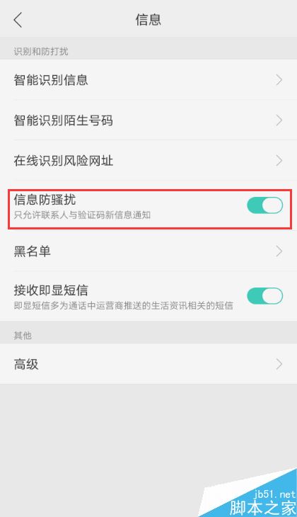 然后关闭【信息防骚扰】,如果开启该功能,陌生号码来信息是无声的(该功能可能部分机型没有)。
