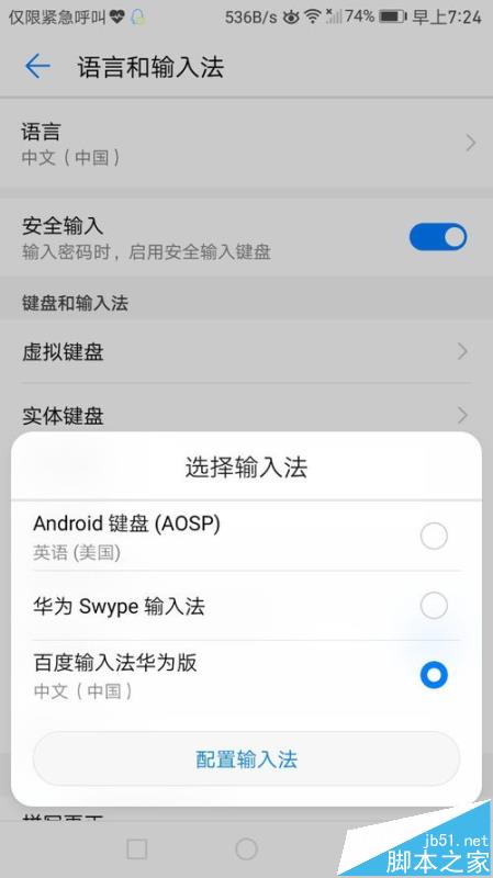 4、现在可以看到手机里面安装了两个输入法百度输入法和华为输入法,点击打开百度输入法