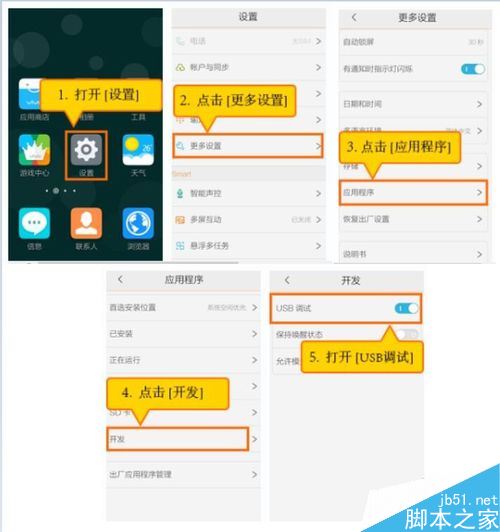 最简单、有效的获取vivo手机ROOT权限的方法,就是借助第三方手机类管理工具实现。对此我们需要打开vivo手机“USB调试”开关。可以按图示方法开启。