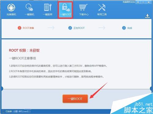 接着切换到“一键ROOT”选项卡,如图所示,此时就可以检测当前手机是否已获得了ROOT权限。当vivo手机尚未获取ROOT权限时,直接点击“一键ROOT”按钮。