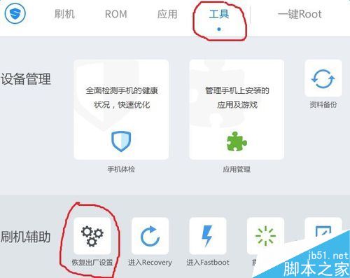 进入一键刷机在弹出来的页面可以找到工具按钮,点击工具按钮后就可以在下方找到恢复手机出厂设置这个功能了