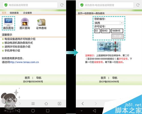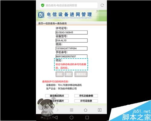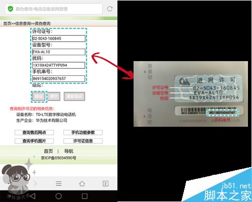 点击【真伪查询】,选择省份,输入许可证号、扰码、手机串号(IMEI)。许可证号、设备型号、扰码、手机串号(IMEI)均可在手机背壳上的电池盖保护膜(背贴)上看到。
