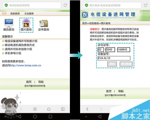 点击【手机服务】>【真伪鉴别】>【网站查询】>【图片查询】,进入“电信设备进网管理”页面。